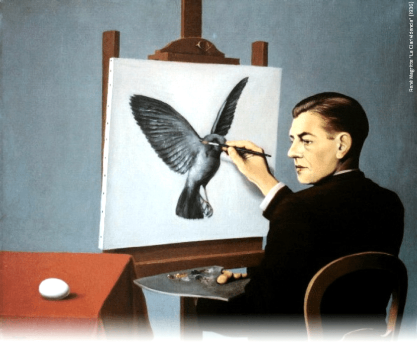 Recuerdo cuando descubrí la obra de René Magritte, artista surrealista belga, que en 1936 pintó un impactante cuadro que tituló «La Clarividencia». La obra representa al mismo Magritte que observa con atención un huevo, al que la lógica nos indica que debería pintar en el lienzo, sin embargo sobre la tela aparece un hermoso pájaro con sus alas desplegadas. Con esta ingeniosa y provocativa imagen, Magritte propone cambiar la percepción pre-condicionada de la realidad y comprometer al espectador a volverse hipersensitivo a su entorno, más allá de lo que aparece.