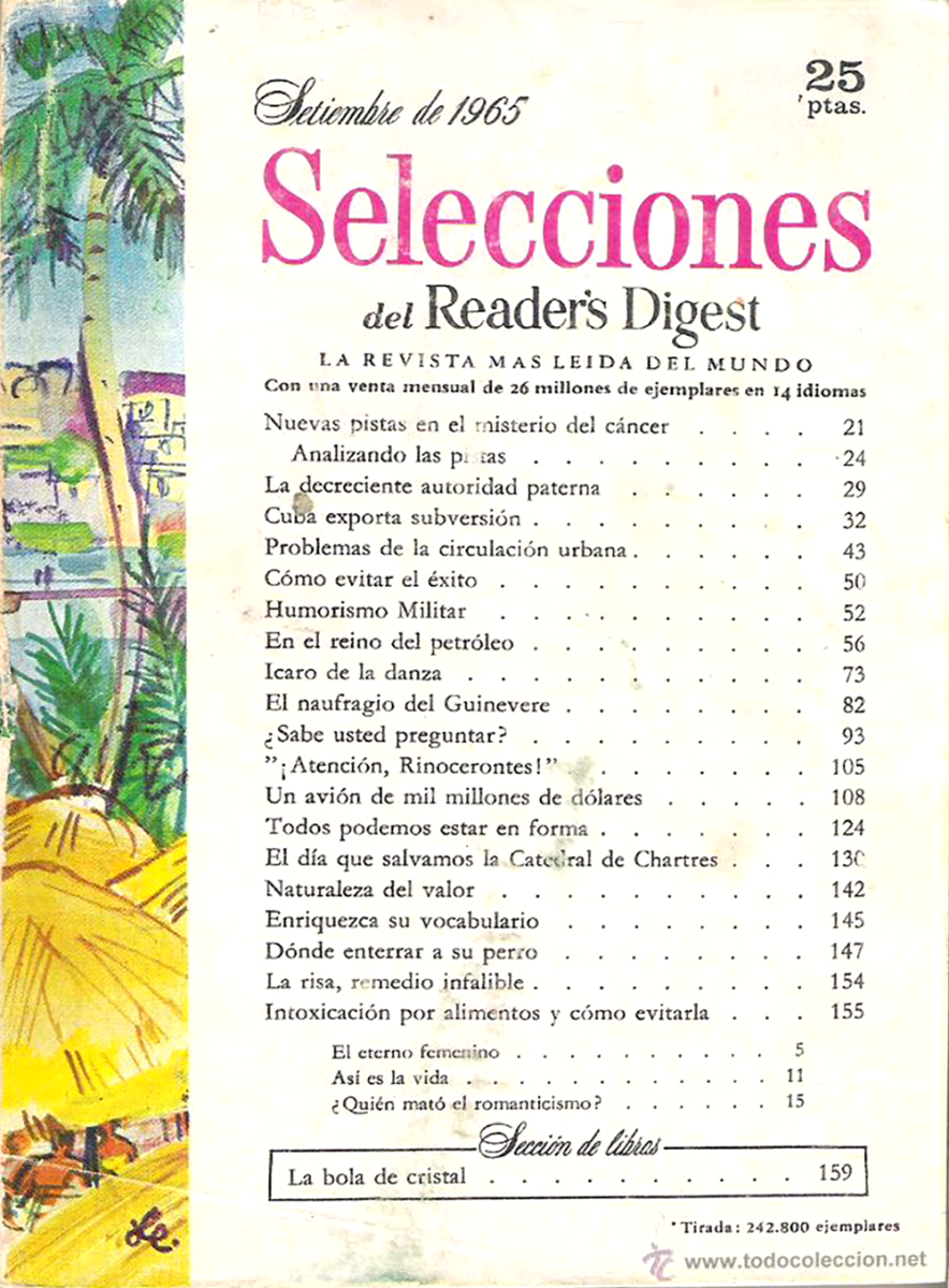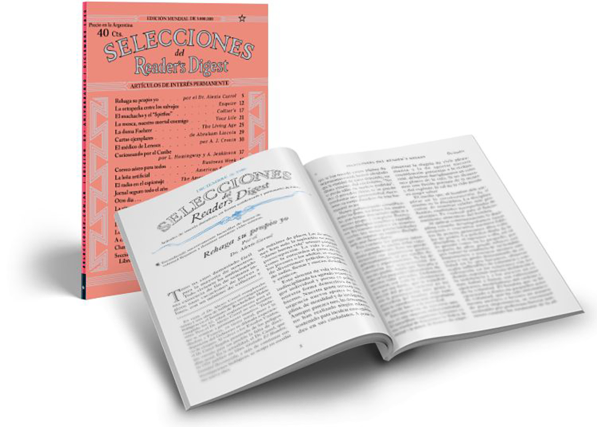 Uno de los fenómenos editoriales más trascendente, expandido a nivel global, no sólo como producto de comunicación masivo, sino como primer y exitoso proyecto de un medio que abarcó casi la totalidad del planeta lo constituye la revista «The Reader’s Digest», que tuvo su origen en Greenwich Village en el año 1922. Sus fundadores, De Witt Wallace y Lila Acheson Wallace lanzaron una publicación en forma de folletín de tamaño bolsillo con la intención de reunir mensualmente en ella treinta artículos extraídos de diferentes revistas, que eran presentados de manera abreviada. Se incluían además, resúmenes de obras de la literatura universal, una sección de humor militar, relatos de lugares exóticos, consejos médicos, vida de religiosos, hazañas de héroes anónimos, anécdotas, juegos, crucigramas, adivinanzas, entre otros. En América Latina se la proyectó con el nombre de «Selecciones» del Reader’s Digest. Llegó a su punto máximo en la década del ´60 y su descenso se produjo a fines de los ´80, continuando aún vigente. Aludiré a ella en tiempo pasado porque haré foco en la línea editorial de los años ´50 y ´60.