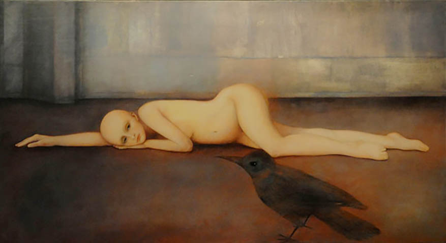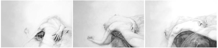 Un recurso fundamental en el arte de Norma Bessouet es la fotografía[1]. Tuve la ocasión de ver numerosas fotografías tomadas por ella, en diversos momentos, con diferentes modelos[2]. En una gran mayoría -como ya dije antes en mis anotaciones- se percibe un cuidado escenográfico que, en todo o en parte, ella traslada al dibujo, a la pintura, al grabado. Hay excepciones, en algunas el fondo es neutro. Es con José Luis Perotta, autor de emblemáticas tapas de discos y sesiones con músicos, que Bessouet se aproxima al mundo de la fotografía. Ante mí, una serie de fotografías y, junto a cada una de ellas, el resultado de la intervención de Bessouet: una imagen de una mujer es transformada en otra imagen con una mujer detrás de una ventana, cerca un gato y, sobre el techo, un ave que emprende vuelo; a una mujer con los brazos extendidos que se refleja en un espejo le agrega otra mujer, casi fantasmal, que la observa desde atrás; a la imagen de mujer desnuda con la cabeza cubierta por un pañuelo sentada en una cama le quita algunos detalles: un diario que está sobre la cama, algunos libros y otros objetos en un mueble que hay detrás; al fondo neutro del espacio donde se tiende una mujer desnuda le agrega una pared y adelante, un ave. Son algunos ejemplos de una práctica habitual en Bessouet, así como su obsesión en despojar de cabello, rapar totalmente, a la modelo de la fotografía. La idea de que esas fotografías valen por sí mismas la avala el hecho de que, en varias de ellas, la artista quitó detalles que bien pudieron ser quitados desde el vamos, en el momento de la toma. Algo así como decir esta es la foto y esta es la obra (dibujo o pintura), las dos valen, las dos cuentan, separadas o relacionadas. Al hacer referencia al tríptico Fragmentos para dominar el silencio/Fragments to Dominate Silence, de 1985, de la serie Selvaggia y Uccello, dice: Mi idea fue captar cada situación como si fuera con una cámara desde diferentes ángulos[3].En este tríptico, como en numerosas otras obras, Bessouet incorpora telas transparentes que envuelven a los cuerpos, recurso que lejos de ocultar subraya la desnudez.