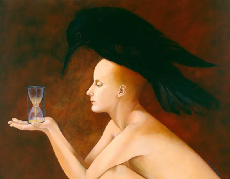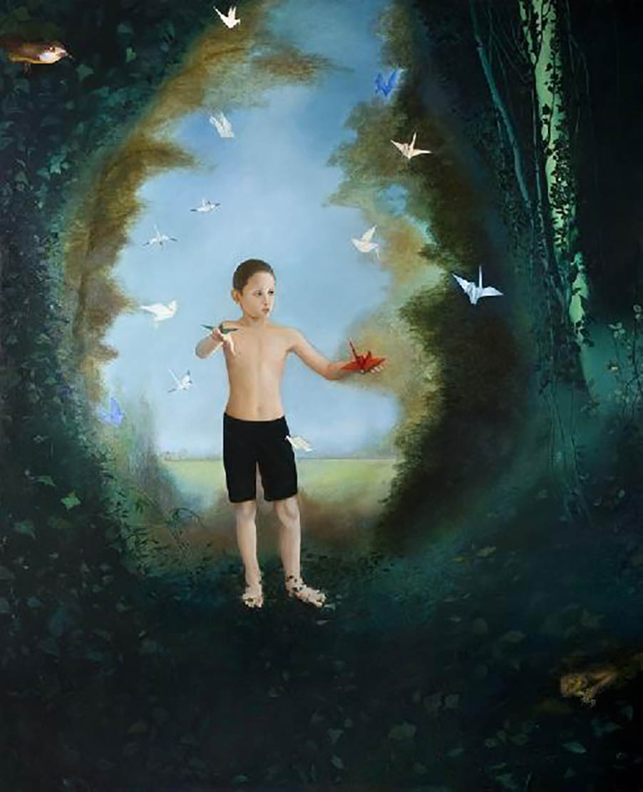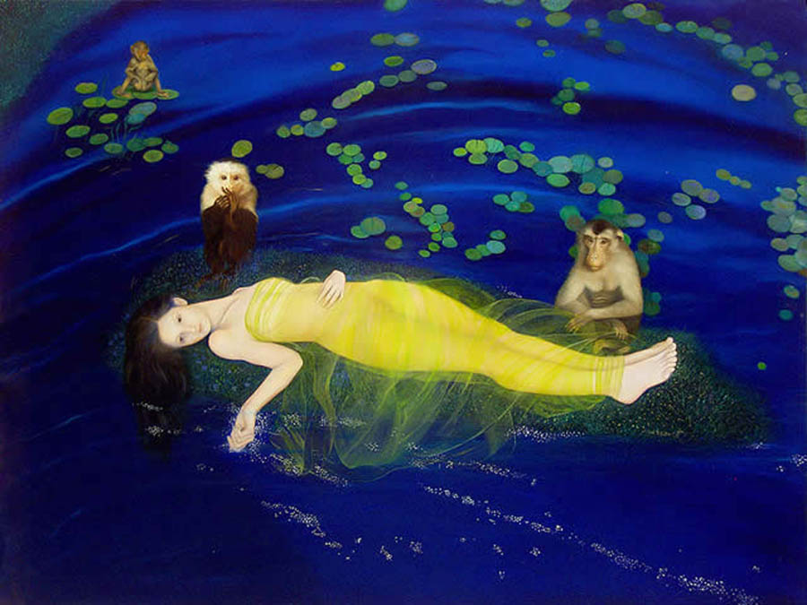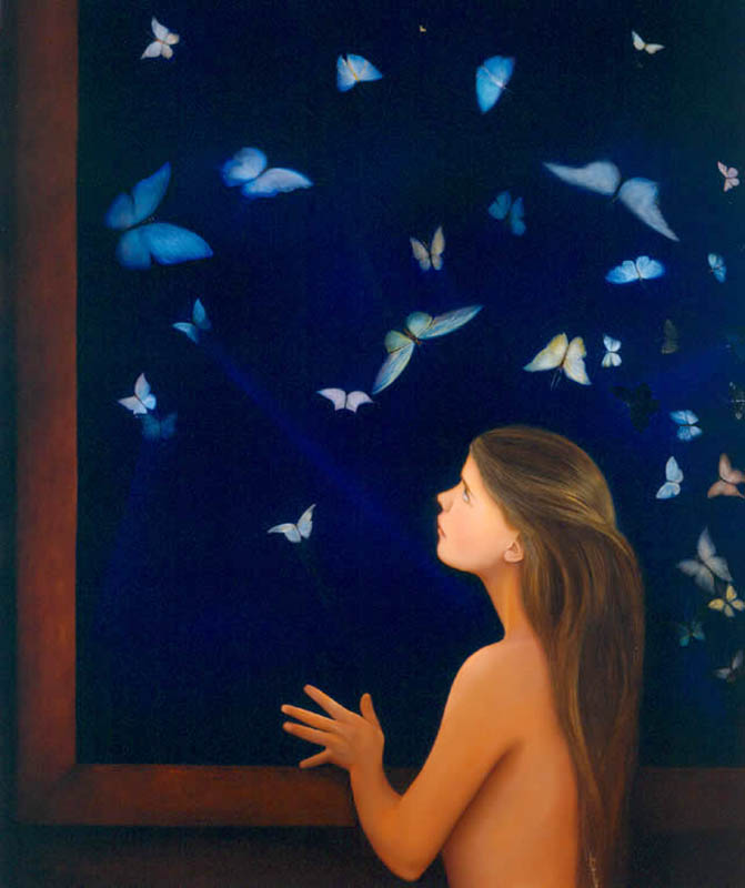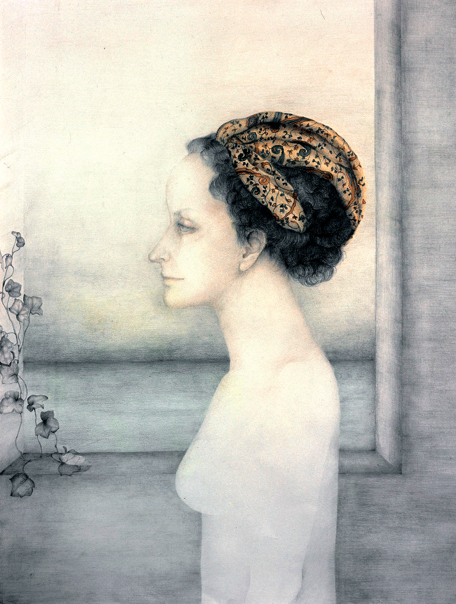 Menos frecuente es el uso de la acuarela[8], pintura sobre papel con colores diluidos en agua. La técnica de la acuarela se basa en la superposición de capas transparentes -lavados-, utilizando la blancura del papel para obtener efectos y toques de luz[9]. En Sanskriti’s Fantastic Birds, de la serie de la India, hay aves diversas y el vestido, los ojos y el cabello de la niña así como la flor que tiene en sus manos, pintados capa sobre capa[10], azules, verdes, negros, rojos; el rostro y los hombros tienen una leve capa de color. En esta obra, además de la acuarela, hay un uso de la punta de plata, una varilla de metal con la que se puede dibujar[11]. Este estilete generalmente va resguardado en un mango de madera o plástico. En cierto modo es bastante similar al grafito, pues al contacto con el papel sus partículas quedan impregnando el dibujo entre las fibras del papel. Con la característica de que los trazos realizados se tornan algo más oscuros al entrar en contacto con la atmósfera. Para trabajar con esta técnica se necesita primero una preparación del papel o soporte a dibujar. Hay varias técnicas de imprimación para preparar los papeles de punta de plata[12]. Una de las más comunes es, precisamente, una solución de acuarela.