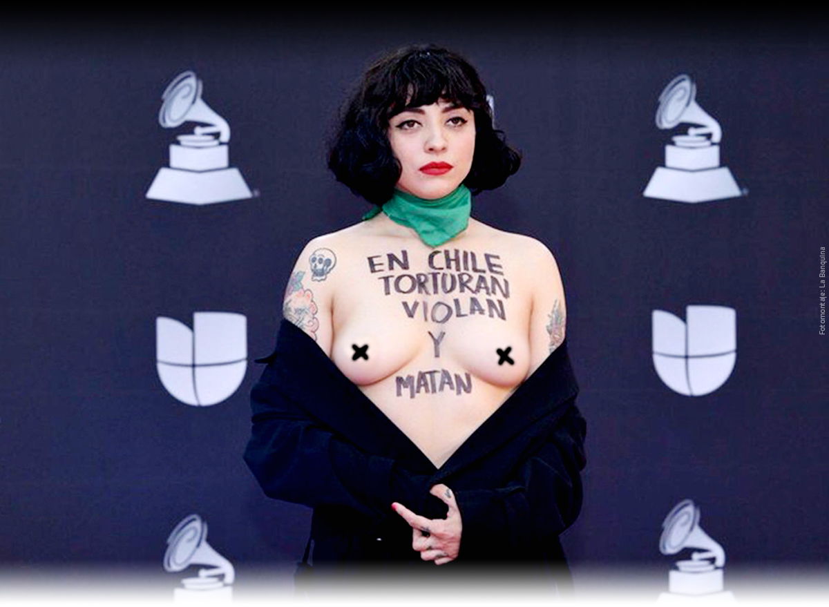 La cantante Mon Laferte llegó a la alfombra roja del Grammy Latino no sólo dispuesta a recibir el Grammy al Mejor Álbum Alternativo, sino también para protestar en contra de la violencia que vivían en esos días los ciudadanos chilenos que se manifestaron en contra del gobierno de Sebastián Piñeira.