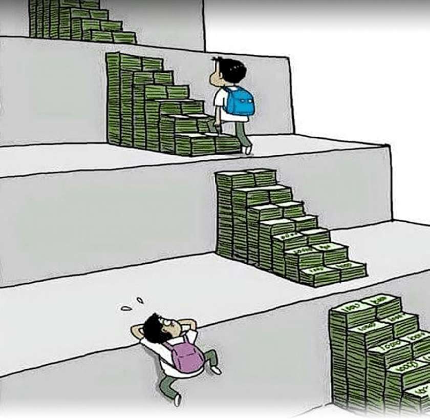 Resultará meritorio que un estudiante logre un doctorado en universidad extranjera, luego de acceder por holgura presupuestaria a la mejor educación disponible, pero será igualmente meritorio el logro de quien, al tiempo que trabaja, termina el bachillerato en la escuela nocturna, cuando a su tiempo debiera postergar esa posibilidad por urgencias económicas. Por imperio pecuniario está escrito de antemano el final: aquél llegará más alto que éste en la escala social.