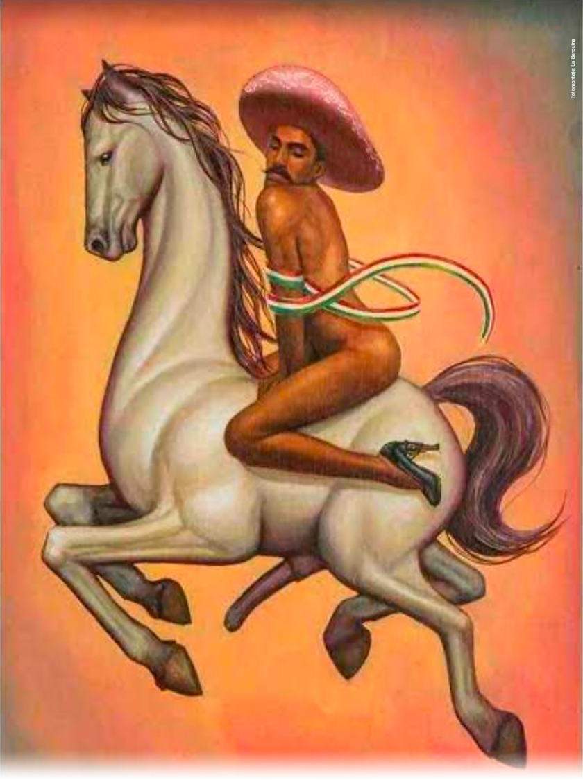 De ese caos armónico, recuerdo, en particular, una obra de pequeño formato: La Revolución. Femenina y subversiva por definición, estuvo llamada al impacto social. En un acertado gesto metonímico, es representada en la imagen icónica de Zapata. La figuración ecuestre muestra al líder mexicano desnudo, con sombrero rosado, recorrido por una cinta con los colores de la bandera y tacones en formas de revólveres. El cuerpo “afeminado” (u “homosexualizado”) dialoga con la masculinidad presupuesta. El caballo, por su parte, hace ostentación de su “bravía” con su genitalidad en excitación. Sin paisaje ni contexto alguno, esta representación de La Revolución mexicana se escapa de la historia oficial para dar lugar a una nueva concretización que centra su mirada en las ausencias. Chairez pudo haber parafraseado a Di Benedetto (Zama, 1956) y dedicar esta obra “A las víctimas de la espera…” ya que emplaza, en La Revolución, la imagen de lo femenino cuestionando los relatos patriarcales. La misoginia propia del machismo deriva, también, en una denigración de lo diverso (LGTBIQ…) Así “las víctimas de la espera…”, negadas por la historia hegemónica, retoman, a través del pincel de Chairez, sus voces largamente acalladas.