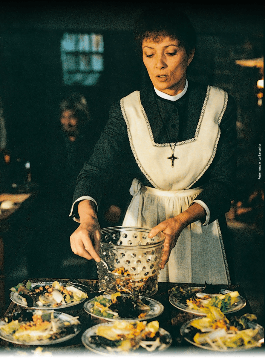 Babette muestra un talento superior para la cocina. Las hermanas le enseñan a preparar bacalao y una sopa de pan con cerveza. A la semana la criada francesa prepara esa comida como cualquiera de los locales. Esto alerta a las hermanas, pues para ellas la vida lujosa es pecado, la comida debe ser lo más sencilla posible.