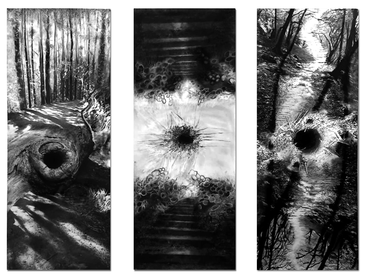 Para Mónica hay una vinculación entre los Senderos con los llamados agujeros de gusano. Un agujero de gusano es un túnel que conecta dos puntos del espacio-tiempo, o dos Universos paralelos. Nunca se ha visto uno y no está demostrado que existan, aunque matemáticamente son posibles. Imagino un túnel que lleve a quien lo atraviesa desde este universo con sus leyes a otro donde esas leyes no se cumplen o se cumplen otras, opuestas. O no se cumple ninguna ley física y todo es, como en el mundo de Alicia, anárquico, donde cada ser y cada cosa está en manos de la locura. Imagino un túnel o un agujero de gusano desde un cuadro, un poema hasta el enigma o secreto que subyace en lo más profundo y a quien lo cruza por fin con el secreto de la creación, revelado. No, esto último no, que quede del arte, del poema, el misterio que les da ánimo, poder, consistencia.
