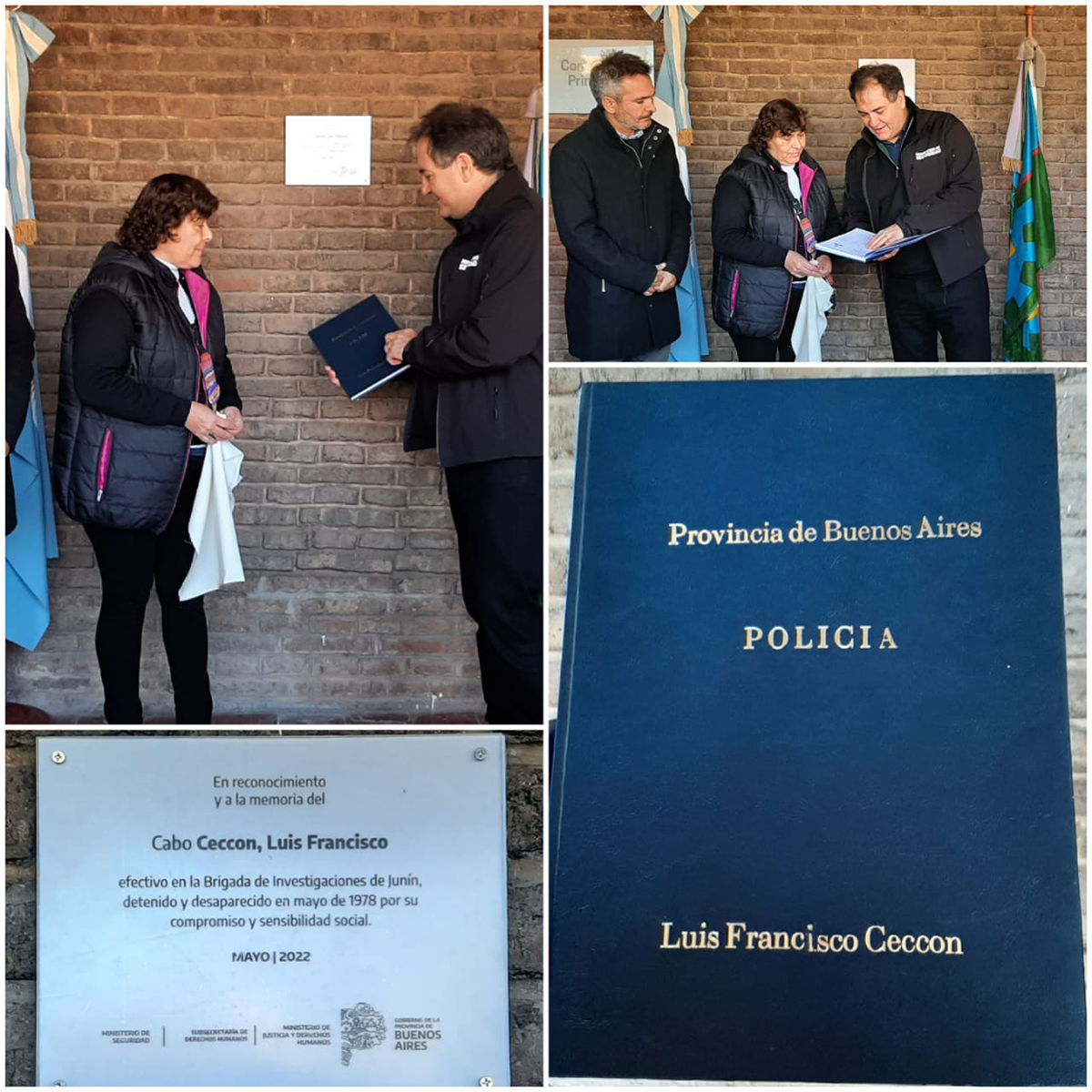 Luis Francisco Ceccon, detenido desaparecido el 16 de mayo de 1978 mientras caminaba por calle Luzuriaga y Lagos de Pergamino. A partir de ese momento la vida de su familia cambió para siempre. Se convirtió en un caso particular por tratarse de un agente en servicio, secuestrado, torturado y desaparecido por la última dictadura. El Equipo Argentino de Antropología Forense identificó sus restos en el cementerio de Gral. Lavalle, partido de la costa, los mismos fueron entregados a sus hijos el 3 de agosto de 2011. Tres años más tarde, la justicia federal en el marco del juicio de Saint Amant II probó que Luis Ceccon fue víctima de los vuelos de la muerte. El Estado que fue capaz de desaparecerlo y al mismo tiempo intimarlo a reincorporarse a sus servicios habituales reparó su legajo cuarenta y cuatro años después.