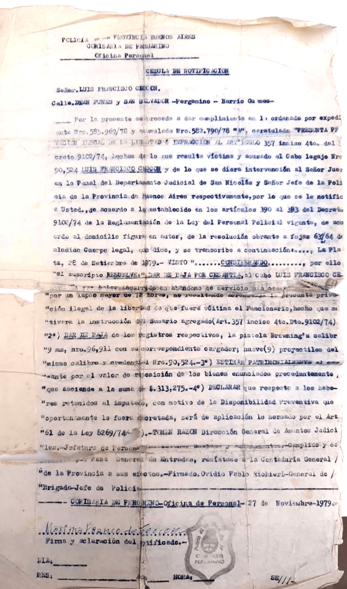 Más de un año después, ya septiembre de 1979 llega la cédula de notificación que expresa: «dar de baja por cesantía al cabo Luis Francisco Ceccon por haber incurrido en abandono de servicio sin causa».