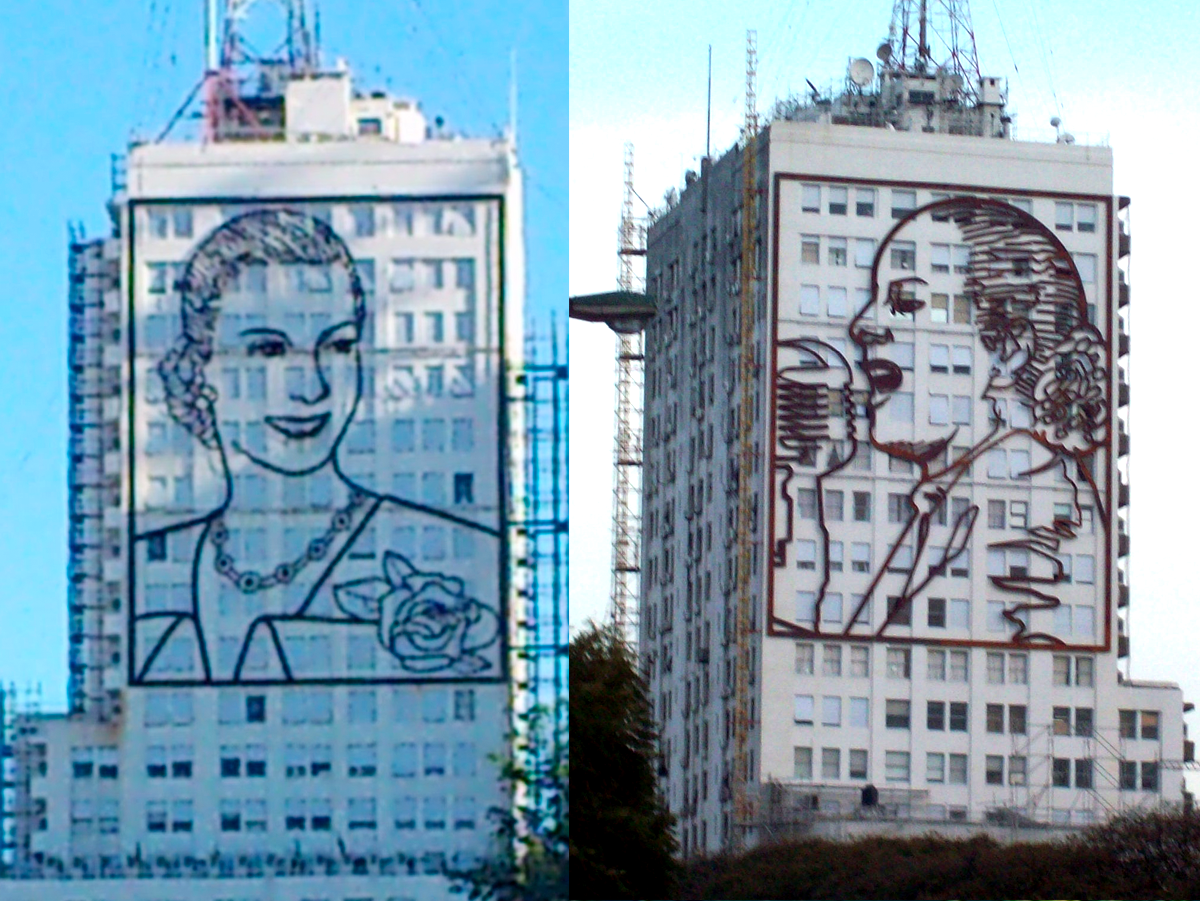 La elección de la ubicación de ambos retratos guarda un importante simbolismo político ya expreso en el decreto que dispone su colocación.2 En efecto, la cara que mira hacia el sur del Gran Buenos Aires, tradicional zona fabril y de barrios obreros, contiene el retrato de una Evita bondadosa y sonriente. En contraste, la imagen de la fachada norte, que da hacia las zonas más tradicionalmente aristocráticas de Buenos Aires, ilustra una Eva combativa dando su discurso al pueblo: La silueta de la Evita que mira al norte es la Eva Perón con el micrófono delante, la boca bien marcada, el pelo tenso que termina en un rodete. Pura fuerza, recrea la foto del discurso del 22 de agosto, un día en que miles de trabajadores hasta pidieron a Perón que dejara a Eva continuar con su discurso. Para muchos peronistas, la Presidenta incluida, esa imagen quedó como el símbolo de la Evita desafiante. Por eso la elección de la pared norte. Una decisión política, más que estética.