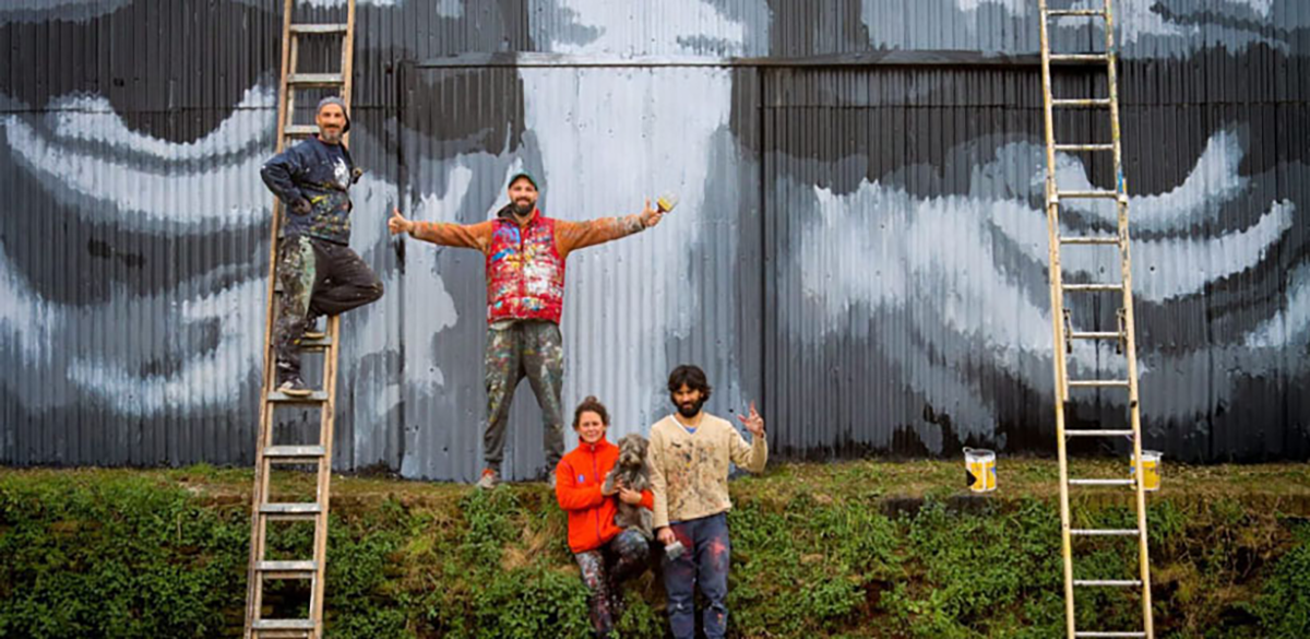 Seis artistas pergaminenses se unieron para trabajar durante 4 días en la pintura de ese gran mural. Bernardo y Federico Calabia, Damián San Martín, Martín Lacuadra, Lucía Minigo y Marco Bentancur, fueron quienes pusieron en marcha la intervención de manera conjunta. Cada uno de ellos respondió a estos interrogantes