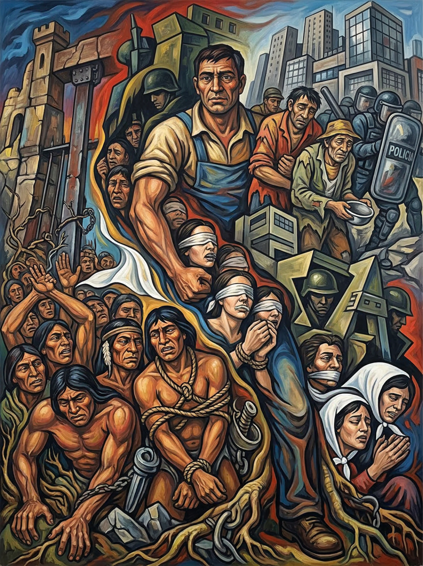 La conquista y colonización de América, es el sometimiento, la dominación y el genocidio, con armas, con enfermedades, la destrucción de comunidades de vida y con ellas el ataque a modos de vida, la sustracción de la tierra instituida en la colonia, tal como lo reclaman aun actualmente diversos pueblos antiguos, originarios, es el ataque a la subsistencia en tanto se les cercena el espacio donde estar, desarrollar, desplegar y mantener una modalidad de vida y la cosmovisión ligada a ello.